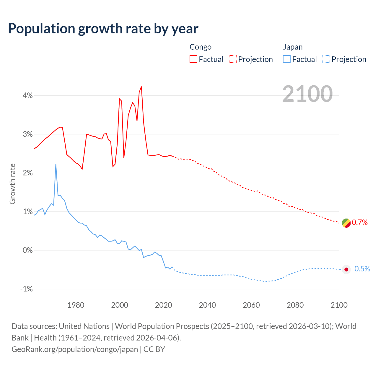 - For the last 10 years, the Congo has had an average growth rate of +2.44% per year vs -0.25% in Japan.