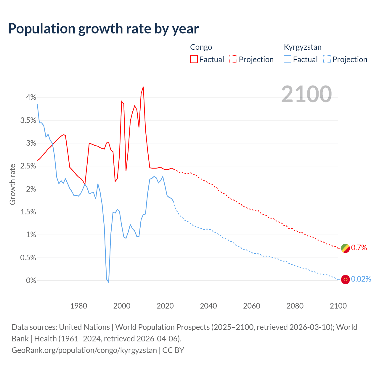 - For the last 10 years, the Congo has had an average growth rate of +2.44% per year vs +2.05% in Kyrgyzstan.