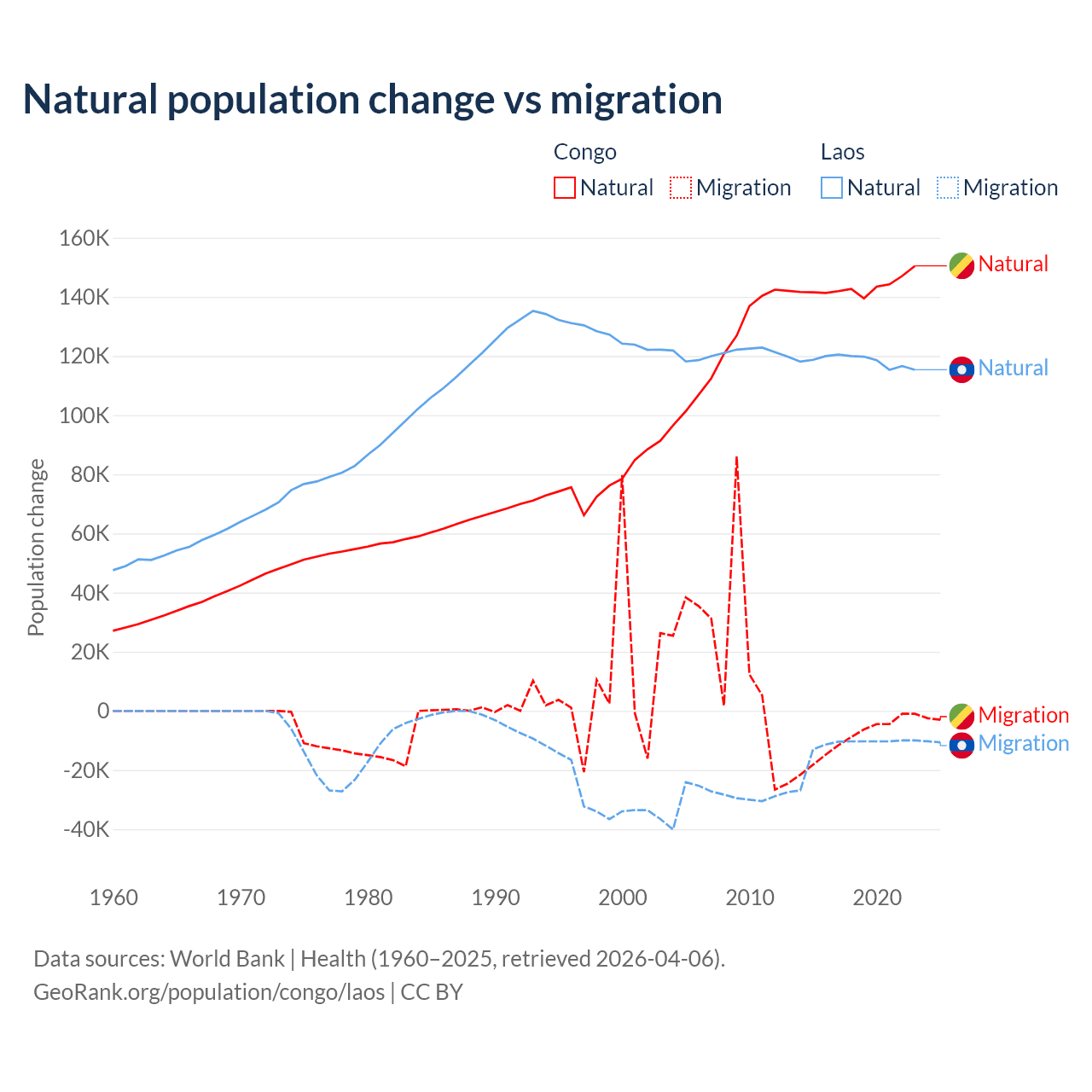 Over the last 10 years, 94% of the population change in the Congo is from natural causes (a gain of 1,434,056 people) and 6.04% is from migration (a loss of 92,251 people). In Laos 90.6% is from natural causes (a gain of 1,183,013 people) and 9.41% is from migration (a loss of 122,899 people).