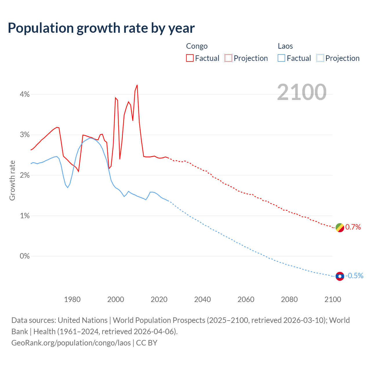 - For the last 10 years, the Congo has had an average growth rate of +2.44% per year vs +1.48% in Laos.