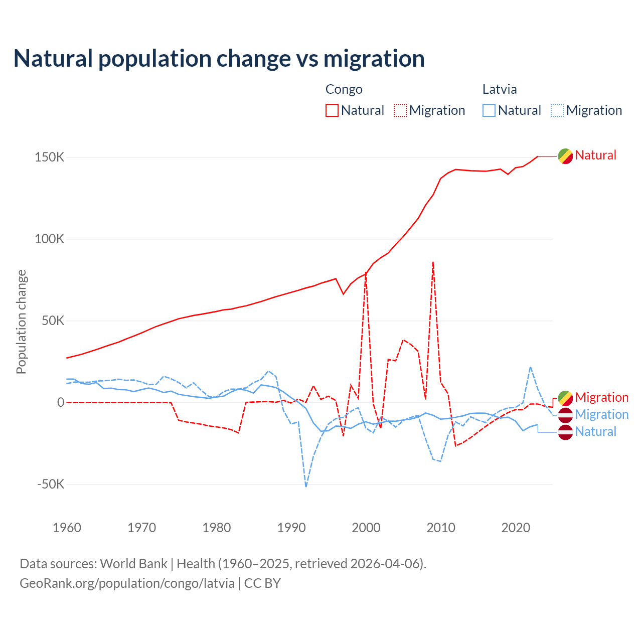 Over the last 10 years, 94% of the population change in the Congo is from natural causes (a gain of 1,434,056 people) and 6.04% is from migration (a loss of 92,251 people). In Latvia 82.7% is from natural causes (a loss of 103,711 people) and 17.3% is from migration (a loss of 21,641 people).