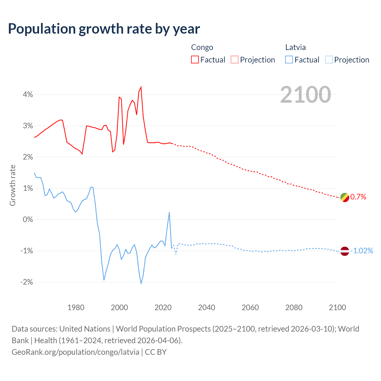 - For the last 10 years, the Congo has had an average growth rate of +2.44% per year vs -0.68% in Latvia.