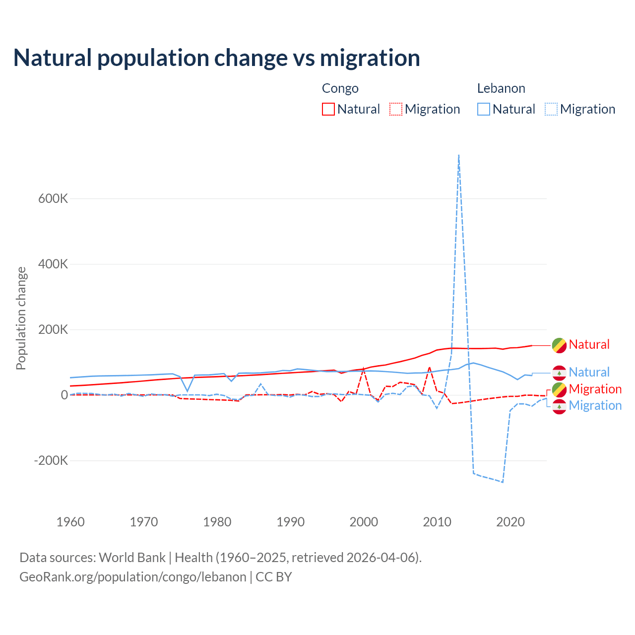 Over the last 10 years, 94% of the population change in the Congo is from natural causes (a gain of 1,434,056 people) and 6.04% is from migration (a loss of 92,251 people). In Lebanon 40.1% is from natural causes (a gain of 739,256 people) and 59.9% is from migration (a loss of 1,103,772 people).