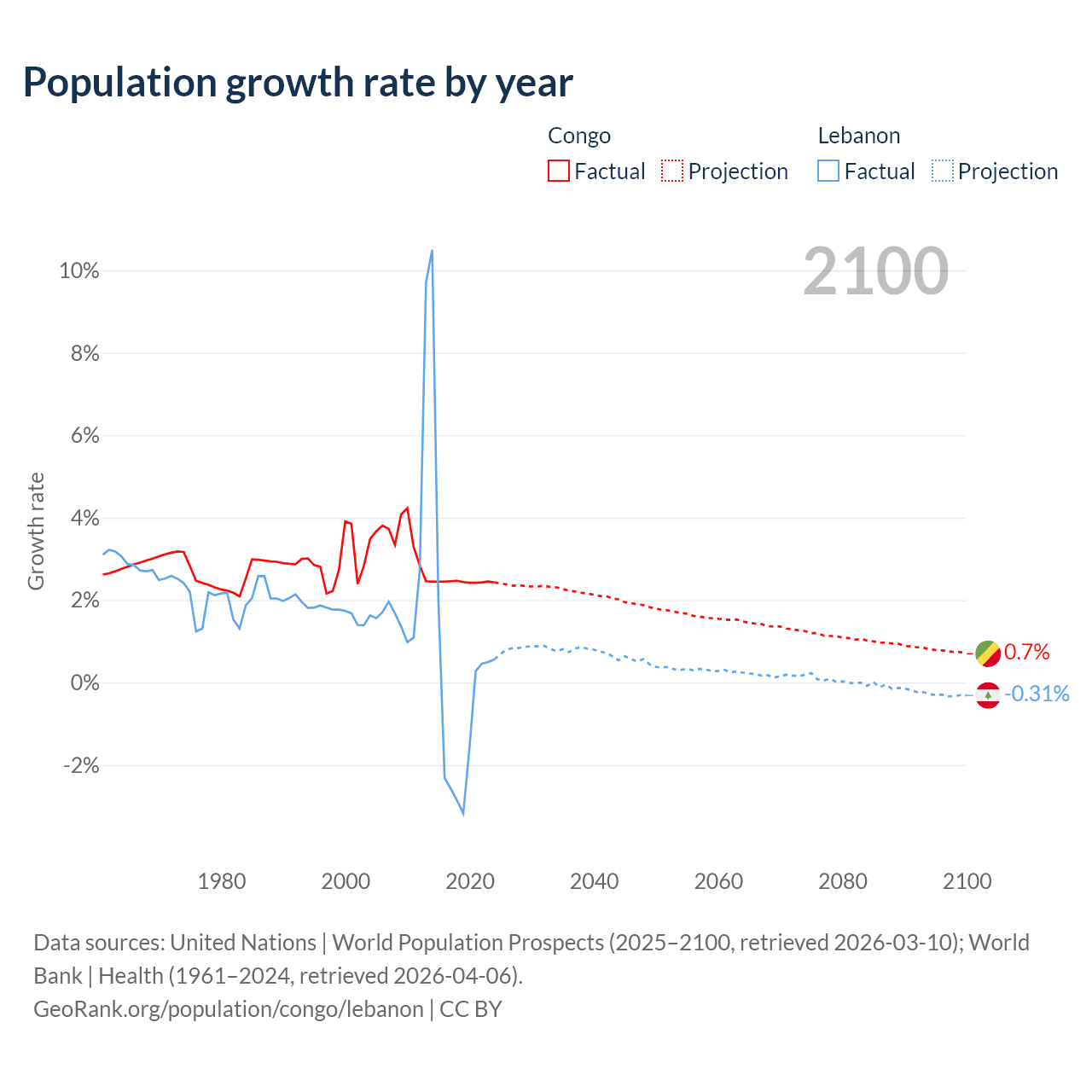 - For the last 10 years, the Congo has had an average growth rate of +2.44% per year vs +0.16% in Lebanon.