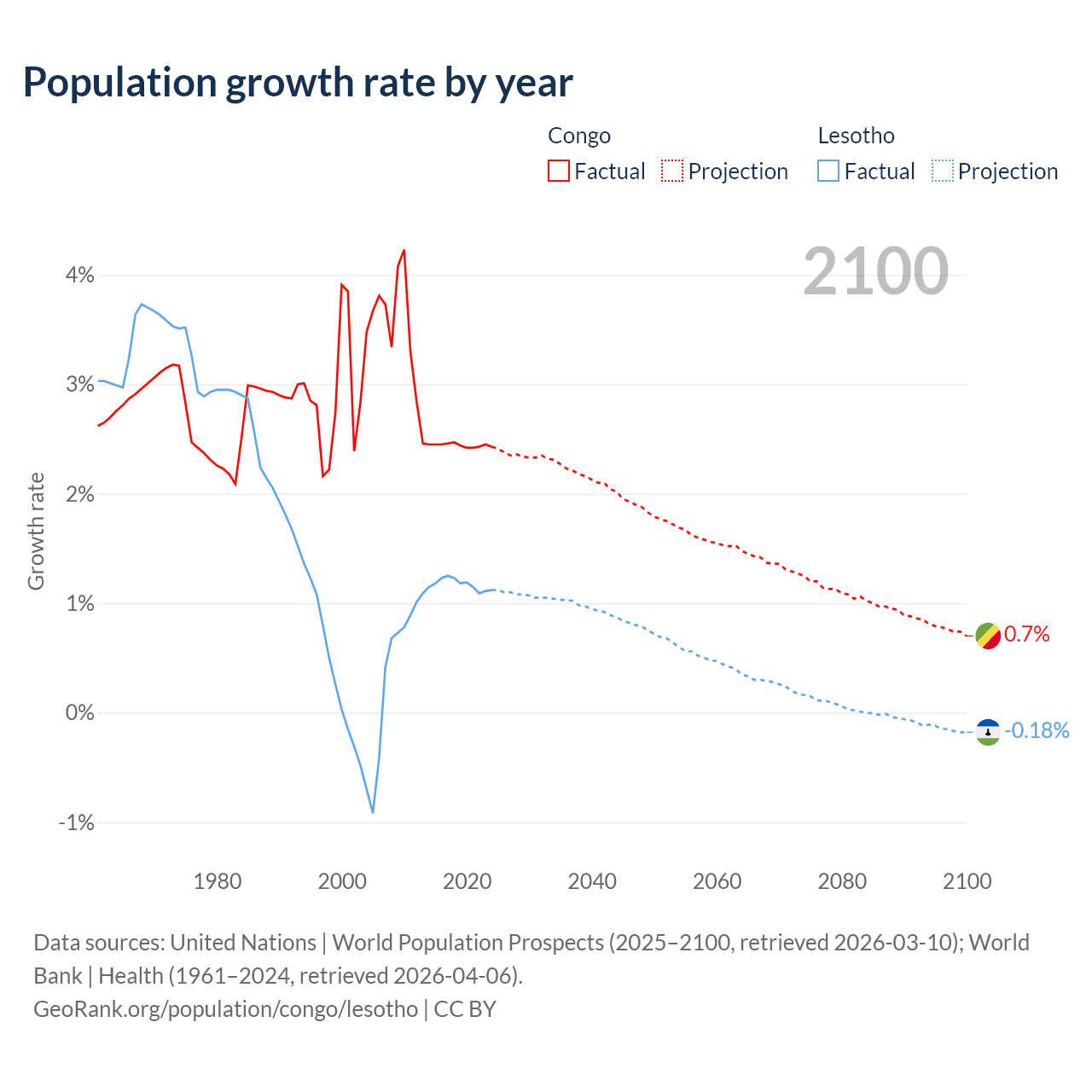 - For the last 10 years, the Congo has had an average growth rate of +2.44% per year vs +1.17% in Lesotho.