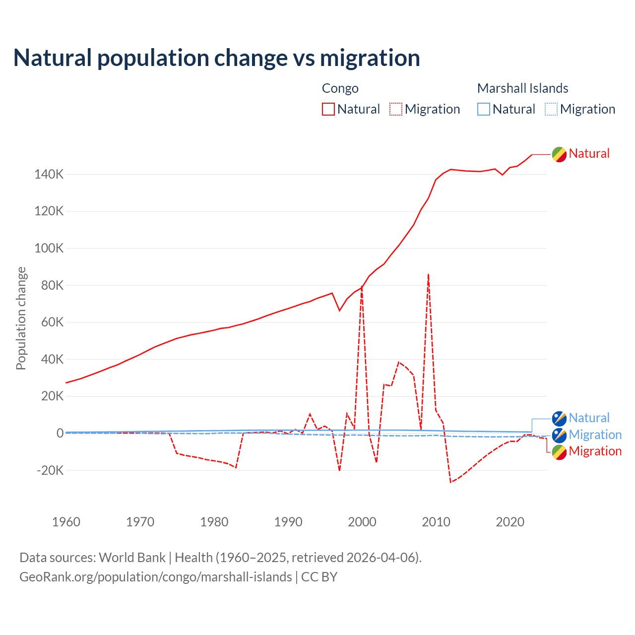 Over the last 10 years, 94% of the population change in the Congo is from natural causes (a gain of 1,434,056 people) and 6.04% is from migration (a loss of 92,251 people). In the Marshall Islands 27.8% is from natural causes (a gain of 7,592 people) and 72.2% is from migration (a loss of 19,682 people).