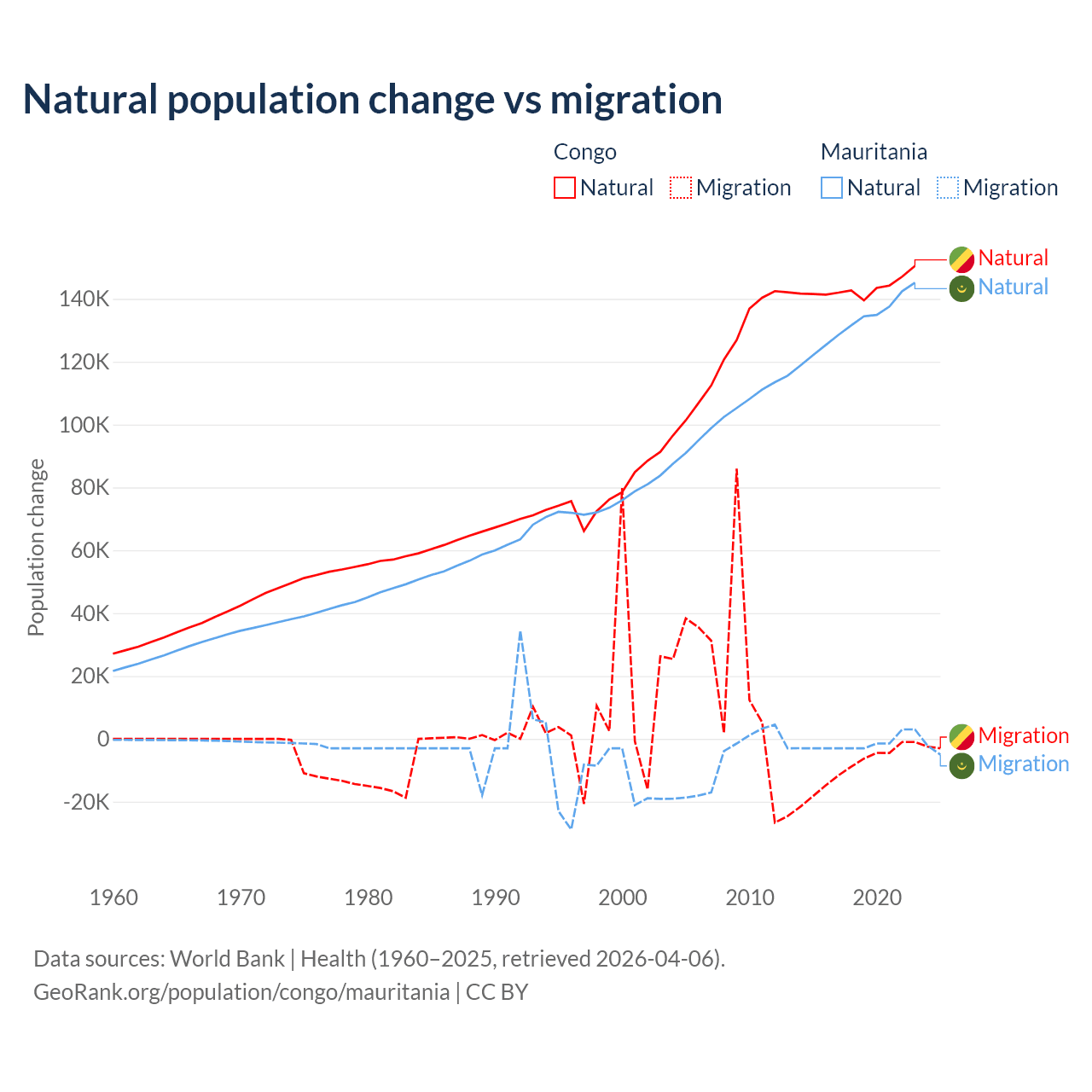 Over the last 10 years, 94% of the population change in the Congo is from natural causes (a gain of 1,434,056 people) and 6.04% is from migration (a loss of 92,251 people). In Mauritania 98.9% is from natural causes (a gain of 1,320,903 people) and 1.12% is from migration (a loss of 14,982 people).