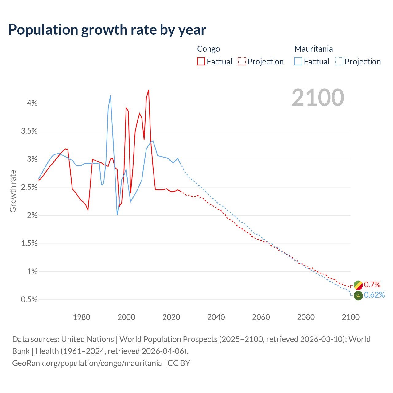 - For the last 10 years, the Congo has had an average growth rate of +2.44% per year vs +3% in Mauritania.