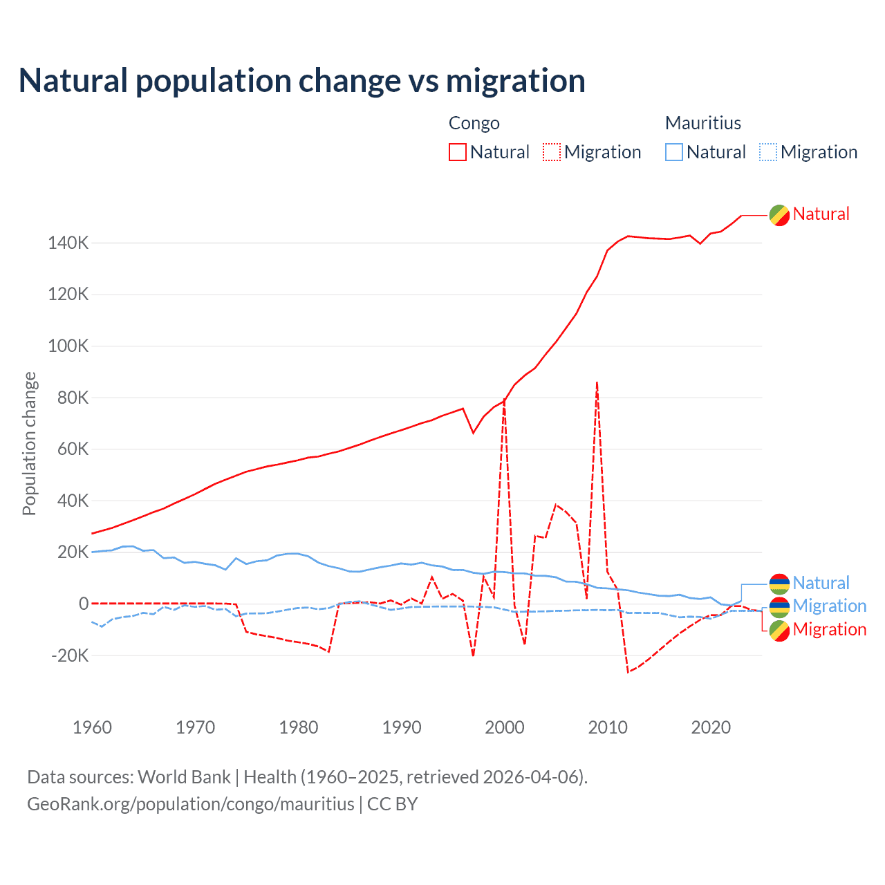 Over the last 10 years, 94% of the population change in the Congo is from natural causes (a gain of 1,434,056 people) and 6.04% is from migration (a loss of 92,251 people). In Mauritius 30.9% is from natural causes (a gain of 19,327 people) and 69.1% is from migration (a loss of 43,294 people).