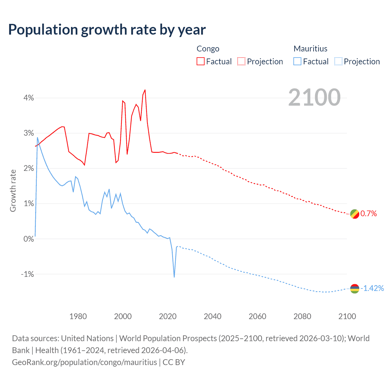 - For the last 10 years, the Congo has had an average growth rate of +2.44% per year vs -0.09% in Mauritius.
