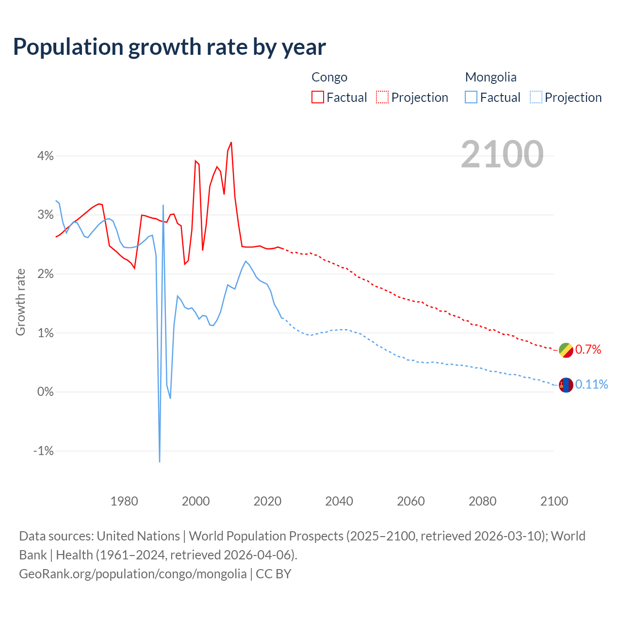 - For the last 10 years, the Congo has had an average growth rate of +2.44% per year vs +1.79% in Mongolia.