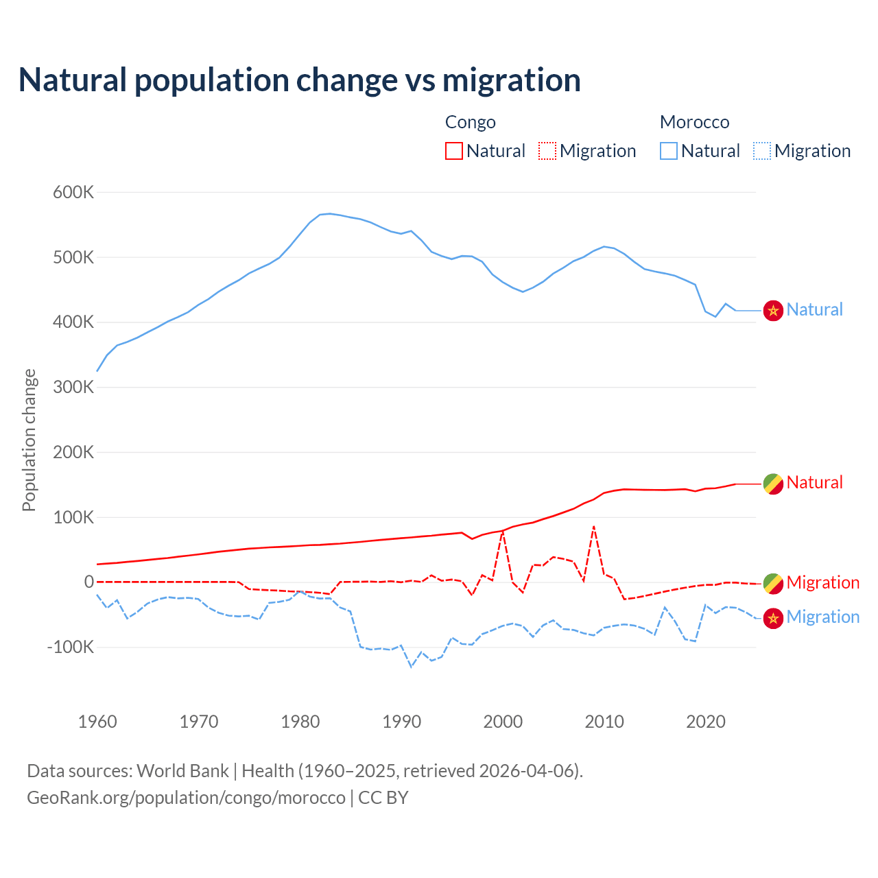 Over the last 10 years, 94% of the population change in the Congo is from natural causes (a gain of 1,434,056 people) and 6.04% is from migration (a loss of 92,251 people). In Morocco 88.3% is from natural causes (a gain of 4,495,223 people) and 11.7% is from migration (a loss of 594,083 people).