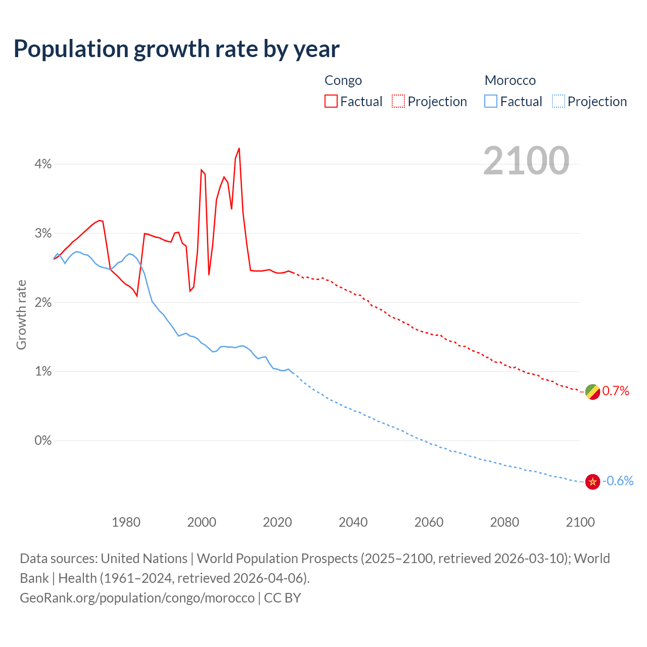- For the last 10 years, the Congo has had an average growth rate of +2.44% per year vs +1.09% in Morocco.
