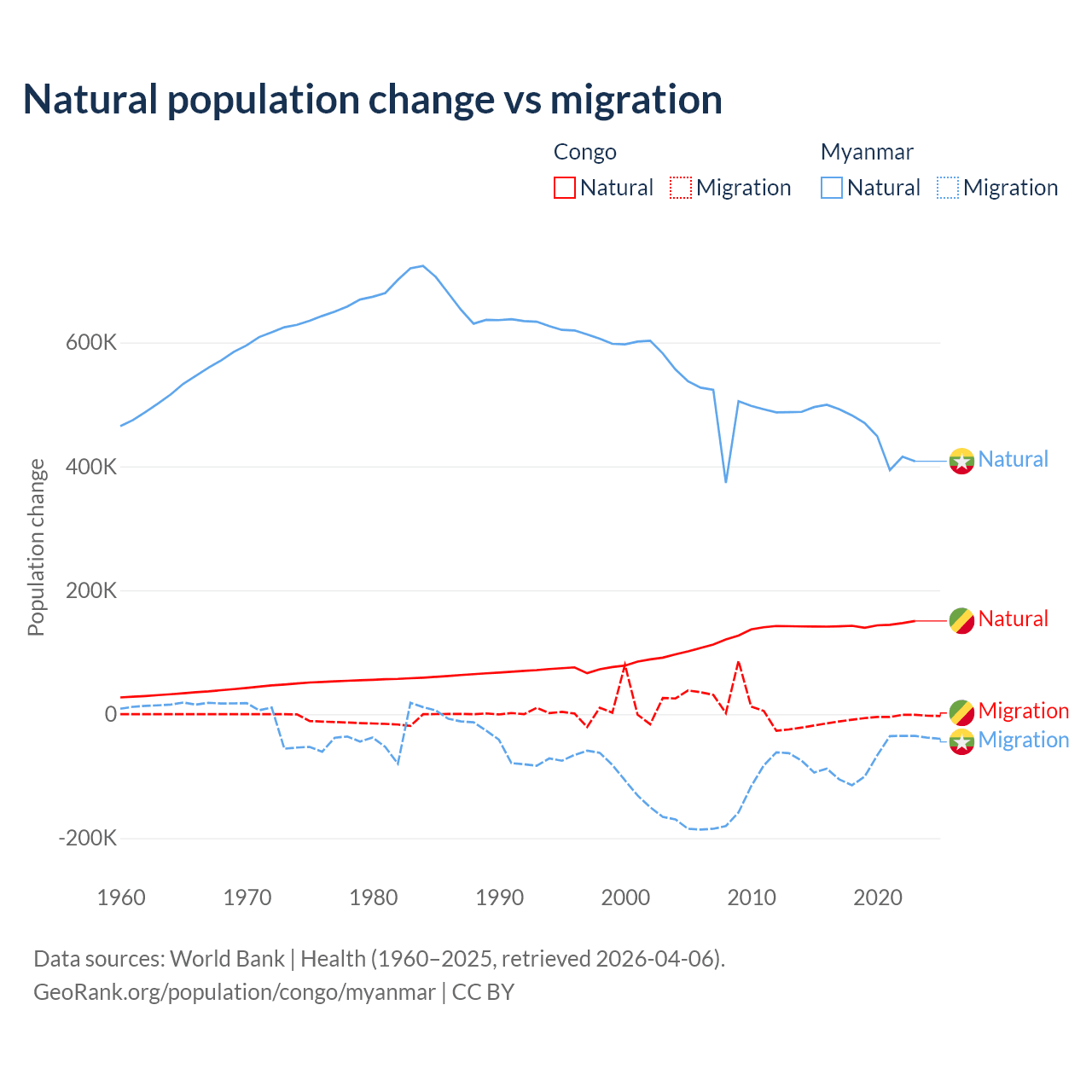 Over the last 10 years, 94% of the population change in the Congo is from natural causes (a gain of 1,434,056 people) and 6.04% is from migration (a loss of 92,251 people). In Myanmar 86% is from natural causes (a gain of 4,594,615 people) and 14% is from migration (a loss of 749,272 people).