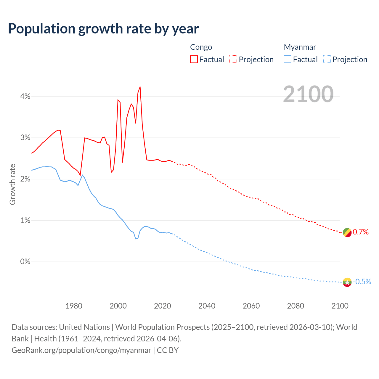 - For the last 10 years, the Congo has had an average growth rate of +2.44% per year vs +0.74% in Myanmar.