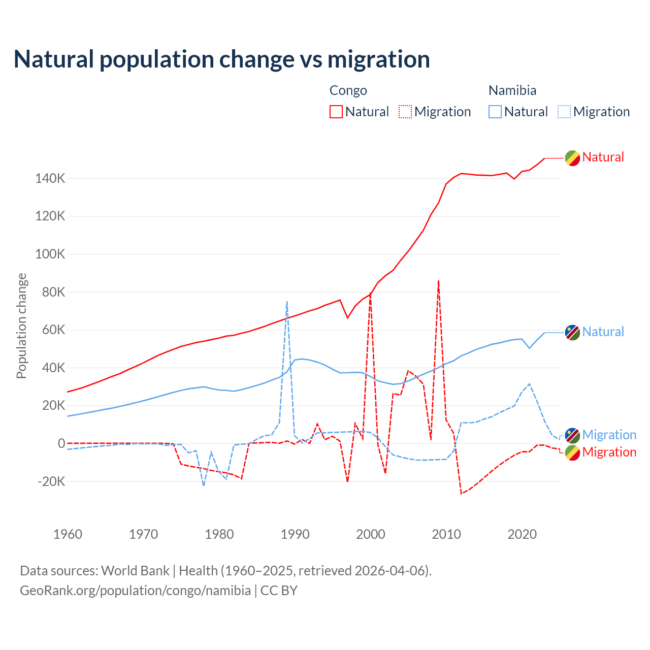 Over the last 10 years, 94% of the population change in the Congo is from natural causes (a gain of 1,434,056 people) and 6.04% is from migration (a loss of 92,251 people). In Namibia 74.3% is from natural causes (a gain of 532,532 people) and 25.7% is from migration (a gain of 183,837 people).
