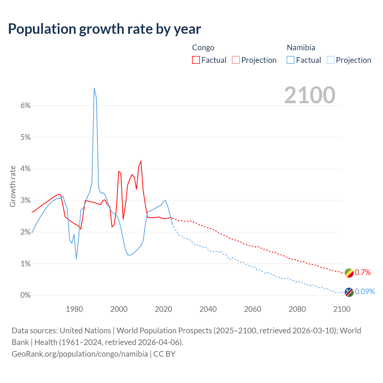 - For the last 10 years, the Congo has had an average growth rate of +2.44% per year vs +2.73% in Namibia.