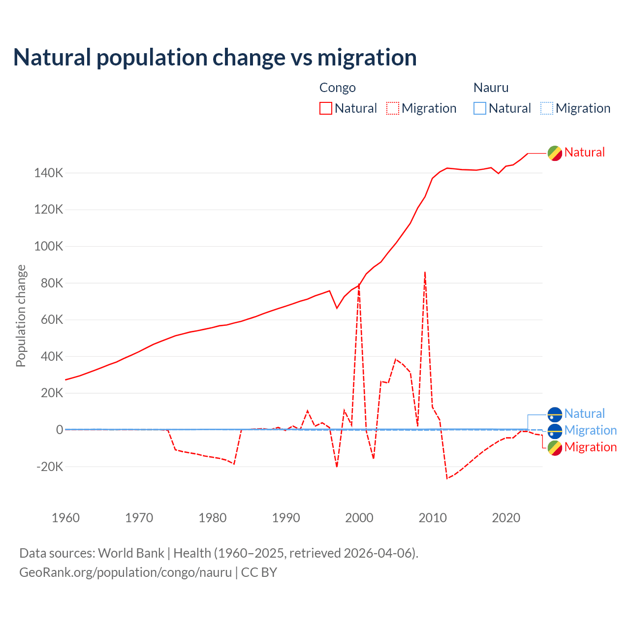 Over the last 10 years, 94% of the population change in the Congo is from natural causes (a gain of 1,434,056 people) and 6.04% is from migration (a loss of 92,251 people). In Nauru 66.2% is from natural causes (a gain of 2,590 people) and 33.8% is from migration (a loss of 1,320 people).
