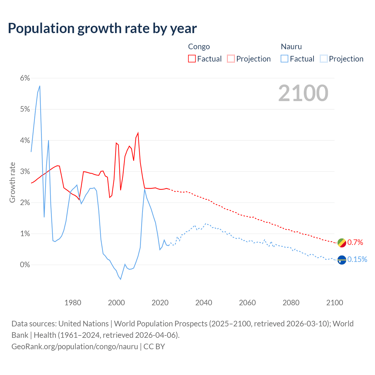 - For the last 10 years, the Congo has had an average growth rate of +2.44% per year vs +1.17% in Nauru.