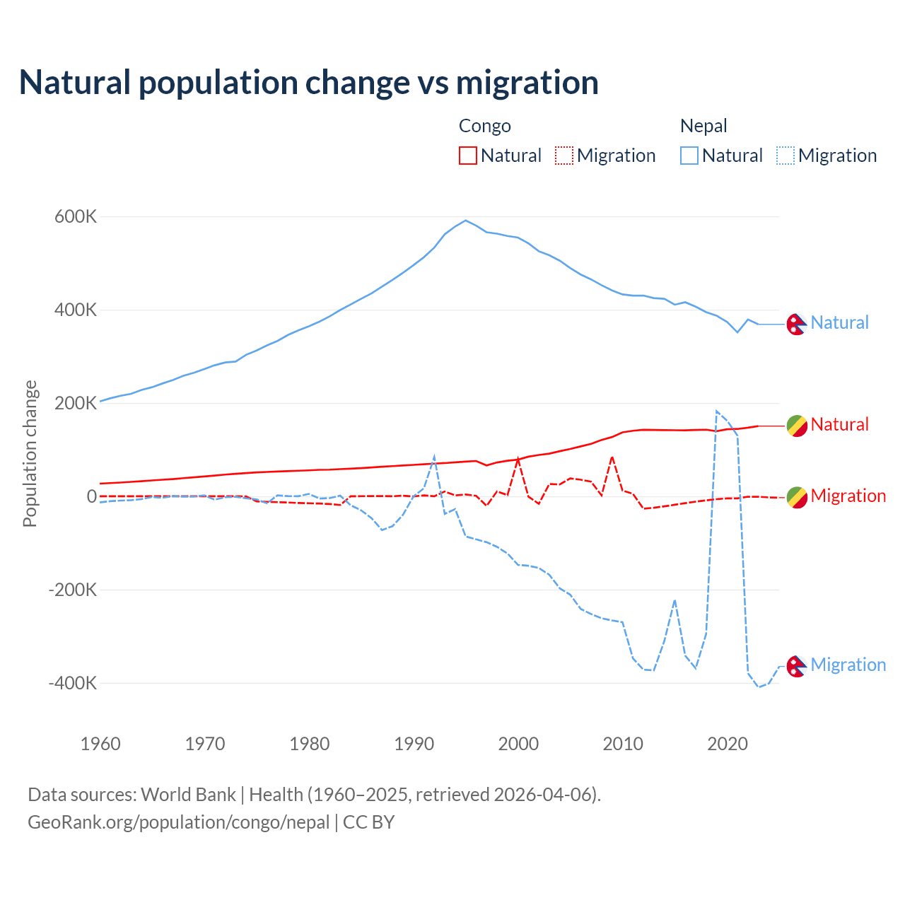 Over the last 10 years, 94% of the population change in the Congo is from natural causes (a gain of 1,434,056 people) and 6.04% is from migration (a loss of 92,251 people). In Nepal 67.9% is from natural causes (a gain of 3,909,749 people) and 32.1% is from migration (a loss of 1,851,664 people).