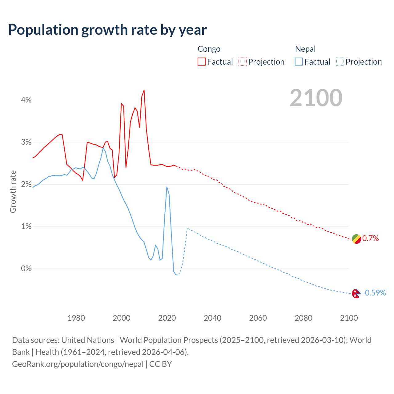 - For the last 10 years, the Congo has had an average growth rate of +2.44% per year vs +0.66% in Nepal.