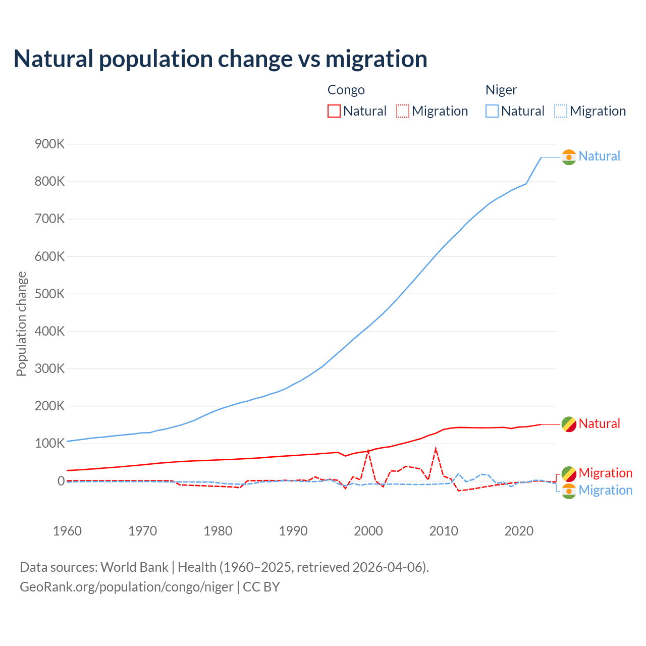 Over the last 10 years, 94% of the population change in the Congo is from natural causes (a gain of 1,434,056 people) and 6.04% is from migration (a loss of 92,251 people). In Niger 100% is from natural causes (a gain of 7,728,287 people) and 0.03% is from migration (a gain of 2,520 people).