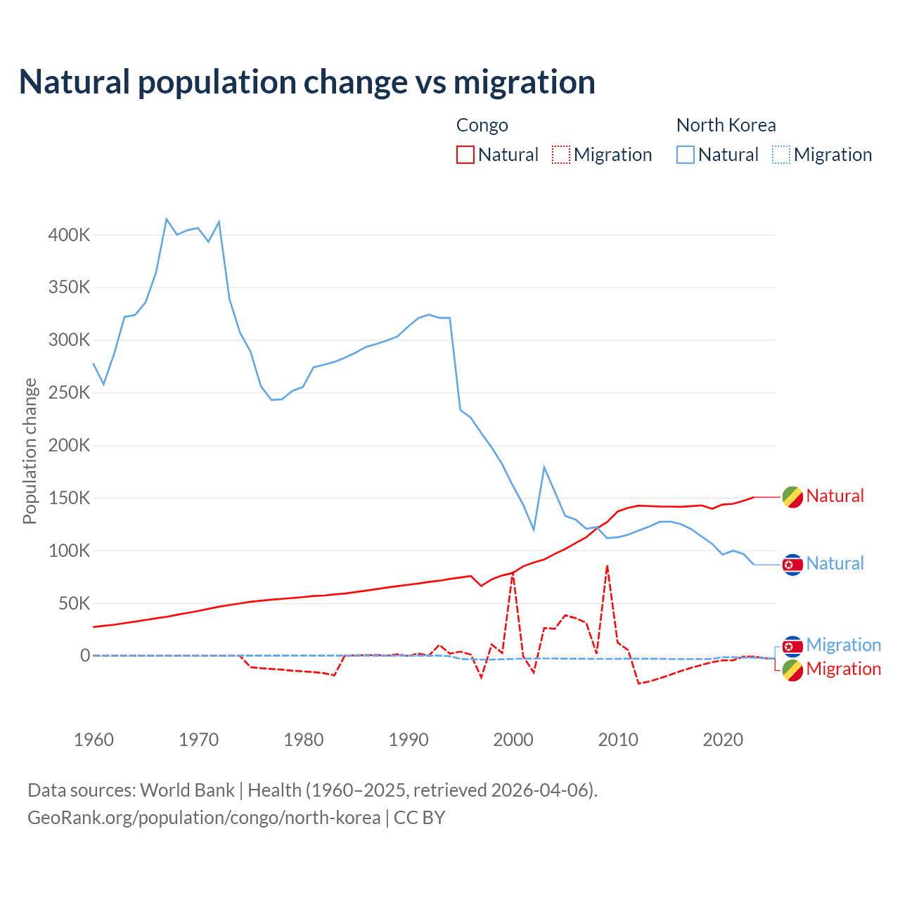 Over the last 10 years, 94% of the population change in the Congo is from natural causes (a gain of 1,434,056 people) and 6.04% is from migration (a loss of 92,251 people). In North Korea 97.7% is from natural causes (a gain of 1,097,372 people) and 2.33% is from migration (a loss of 26,227 people).