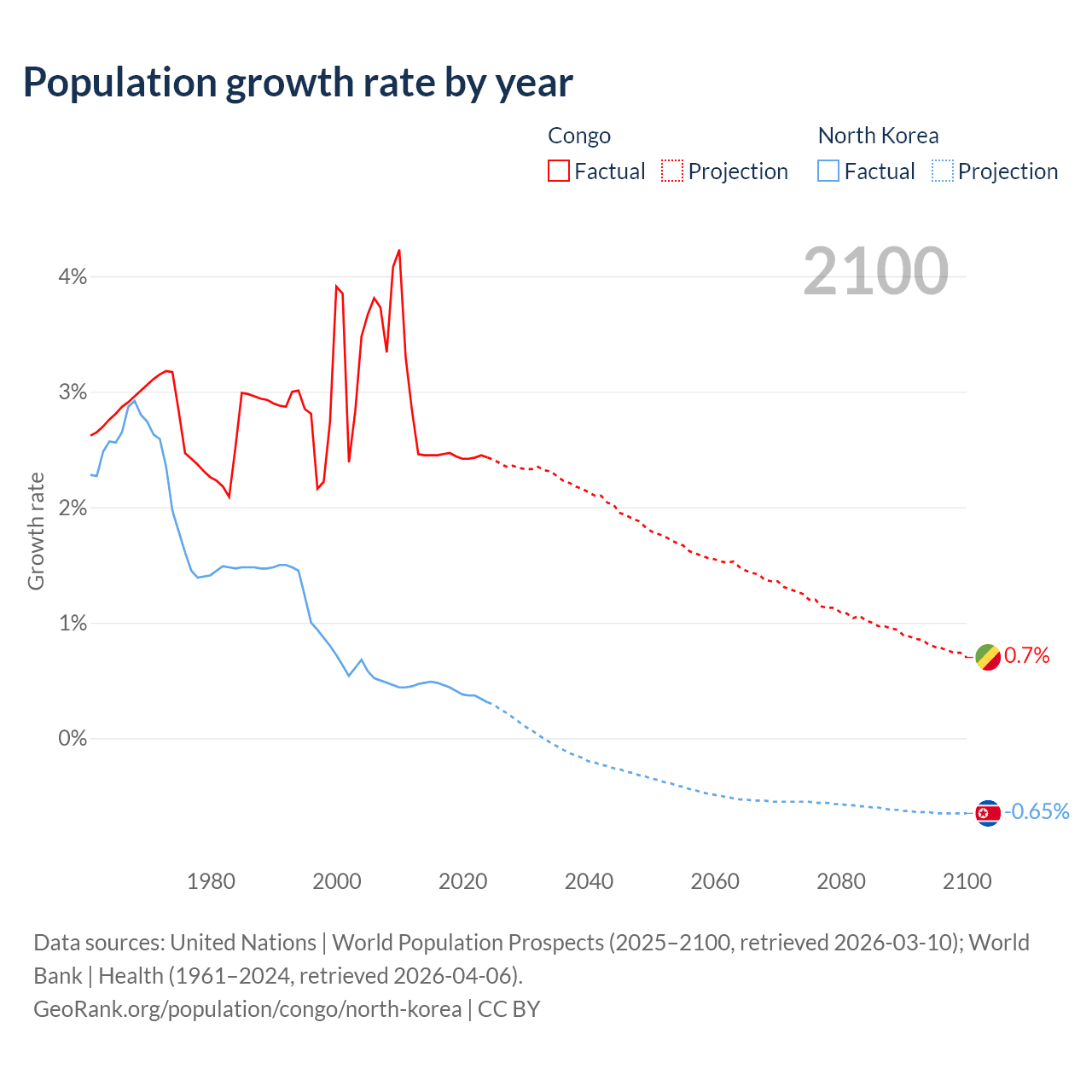 - For the last 10 years, the Congo has had an average growth rate of +2.44% per year vs +0.41% in North Korea.