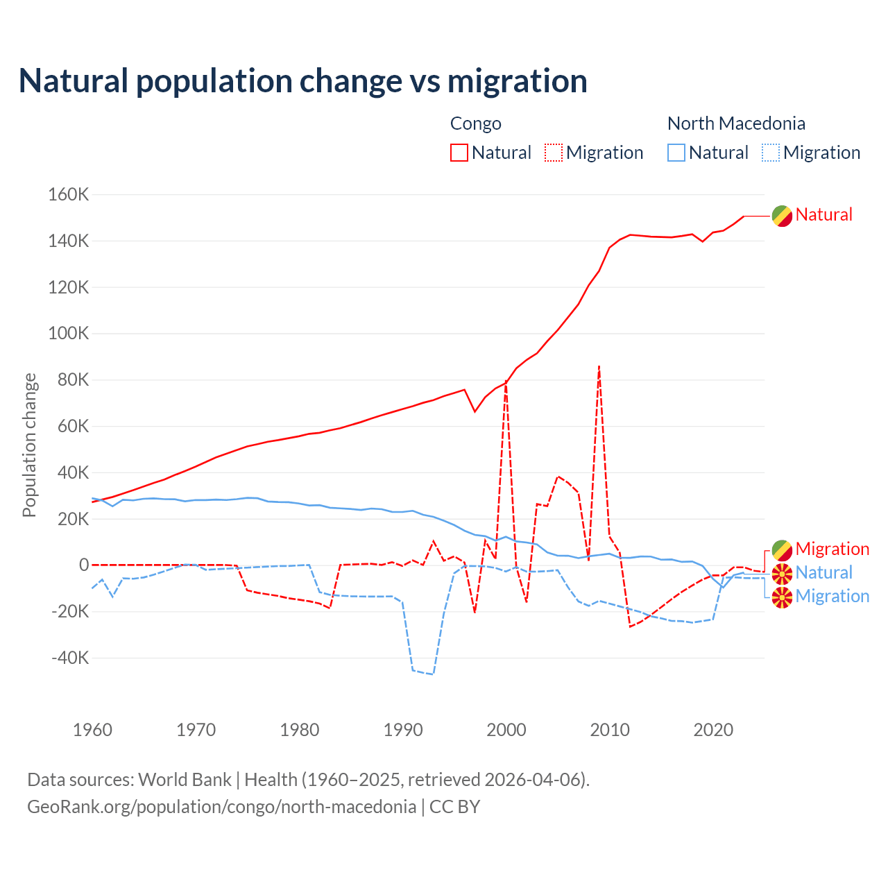 Over the last 10 years, 94% of the population change in the Congo is from natural causes (a gain of 1,434,056 people) and 6.04% is from migration (a loss of 92,251 people). In North Macedonia 6.45% is from natural causes (a loss of 12,585 people) and 93.5% is from migration (a loss of 182,429 people).