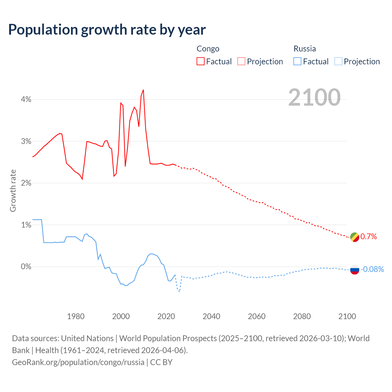 - For the last 10 years, the Congo has had an average growth rate of +2.44% per year vs -0.02% in Russia.