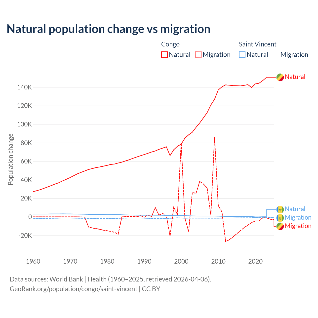 Over the last 10 years, 94% of the population change in the Congo is from natural causes (a gain of 1,434,056 people) and 6.04% is from migration (a loss of 92,251 people). In Saint Vincent 21.2% is from natural causes (a gain of 2,525 people) and 78.8% is from migration (a loss of 9,393 people).