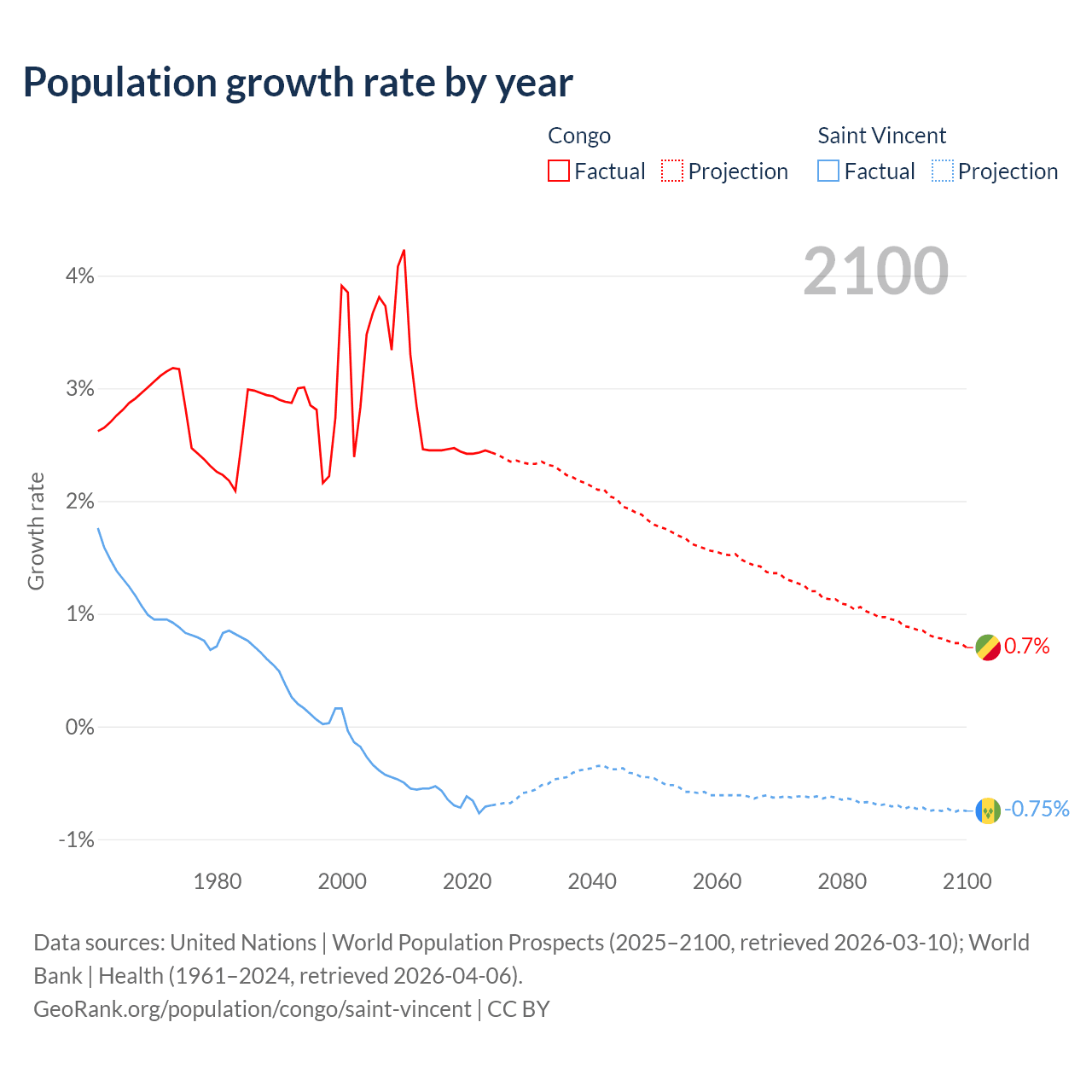 - For the last 10 years, the Congo has had an average growth rate of +2.44% per year vs -0.65% in Saint Vincent.