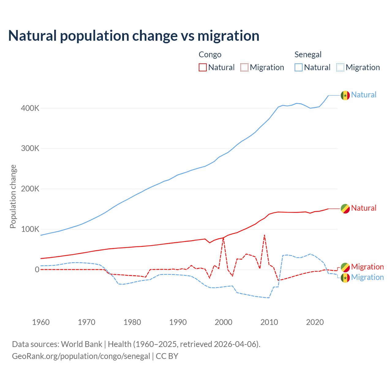 Over the last 10 years, 94% of the population change in the Congo is from natural causes (a gain of 1,434,056 people) and 6.04% is from migration (a loss of 92,251 people). In Senegal 93.9% is from natural causes (a gain of 4,089,205 people) and 6.13% is from migration (a gain of 267,266 people).