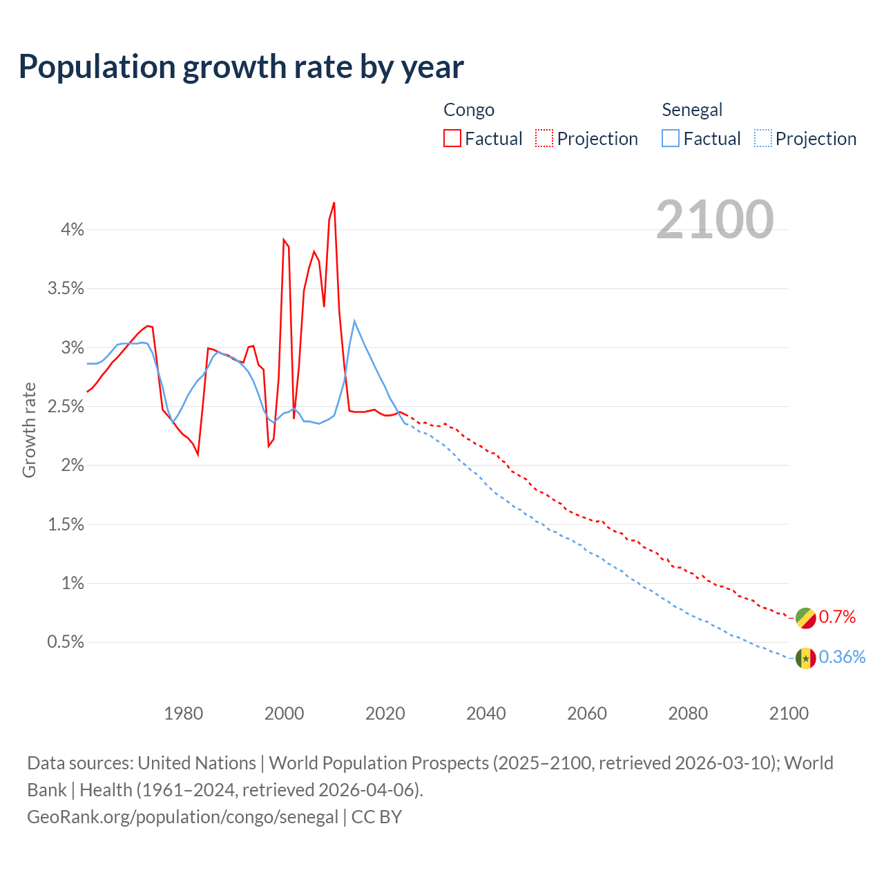 - For the last 10 years, the Congo has had an average growth rate of +2.44% per year vs +2.76% in Senegal.