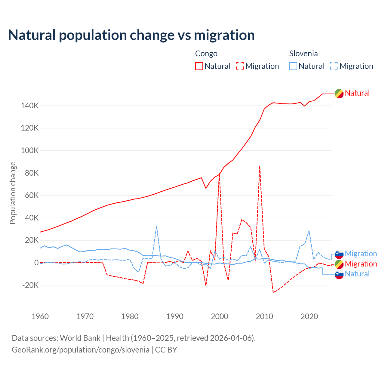 Over the last 10 years, 94% of the population change in the Congo is from natural causes (a gain of 1,434,056 people) and 6.04% is from migration (a loss of 92,251 people). In Slovenia 18.1% is from natural causes (a loss of 17,573 people) and 81.9% is from migration (a gain of 79,532 people).