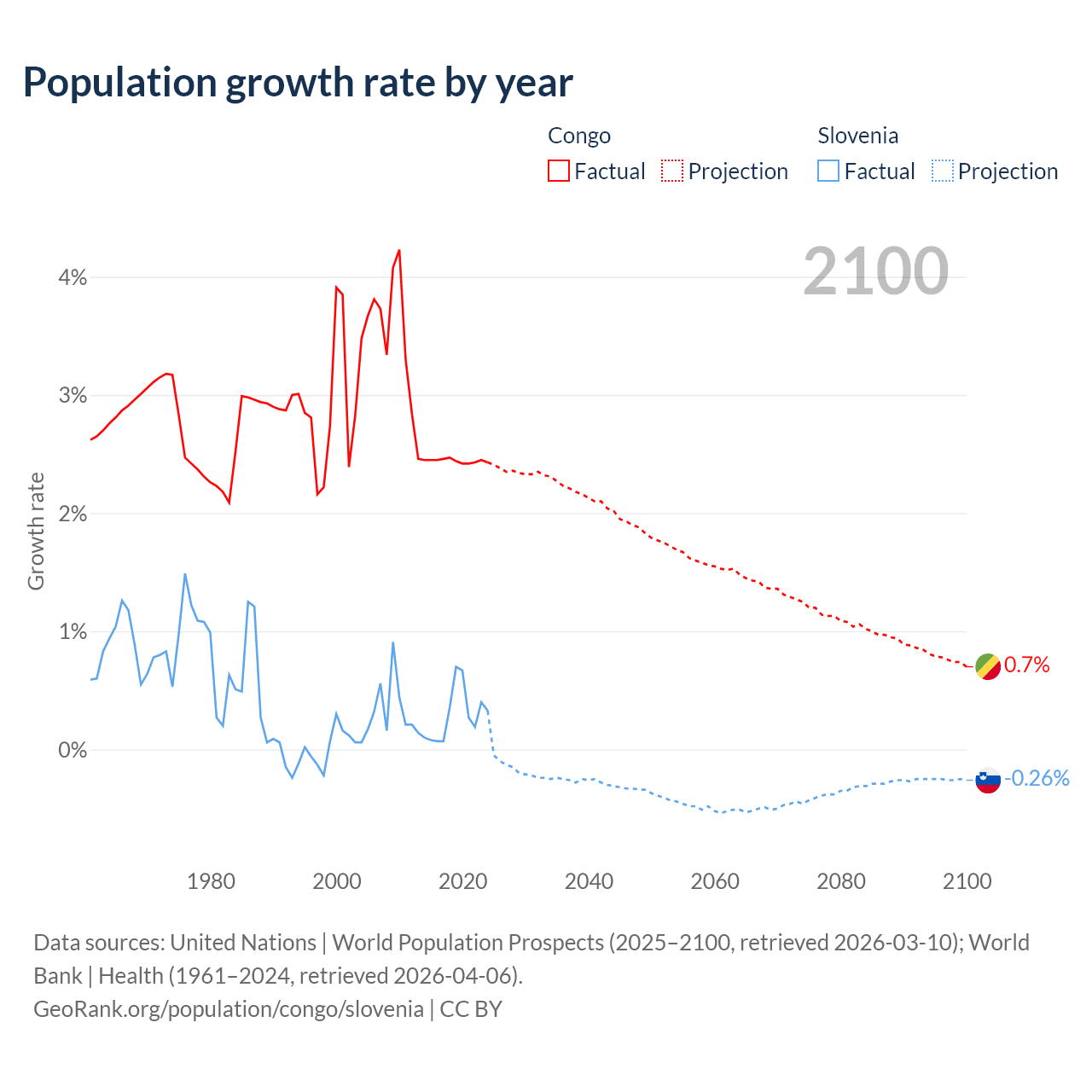 - For the last 10 years, the Congo has had an average growth rate of +2.44% per year vs +0.29% in Slovenia.