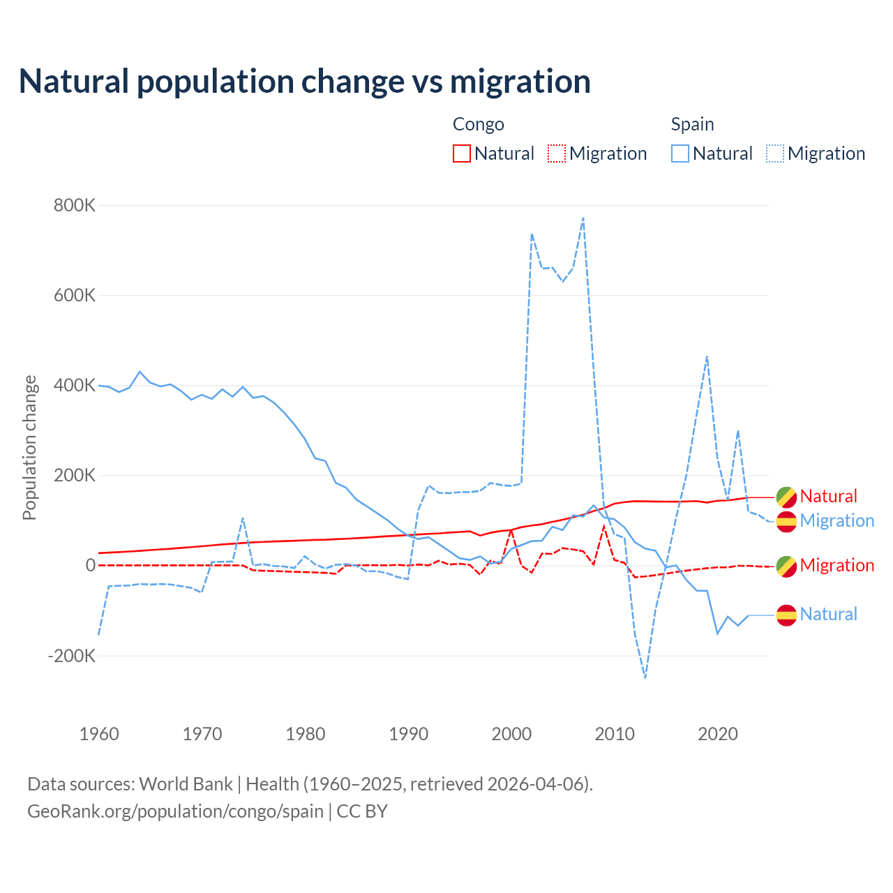 Over the last 10 years, 94% of the population change in the Congo is from natural causes (a gain of 1,434,056 people) and 6.04% is from migration (a loss of 92,251 people). In Spain 25.8% is from natural causes (a loss of 627,829 people) and 74.2% is from migration (a gain of 1,810,127 people).
