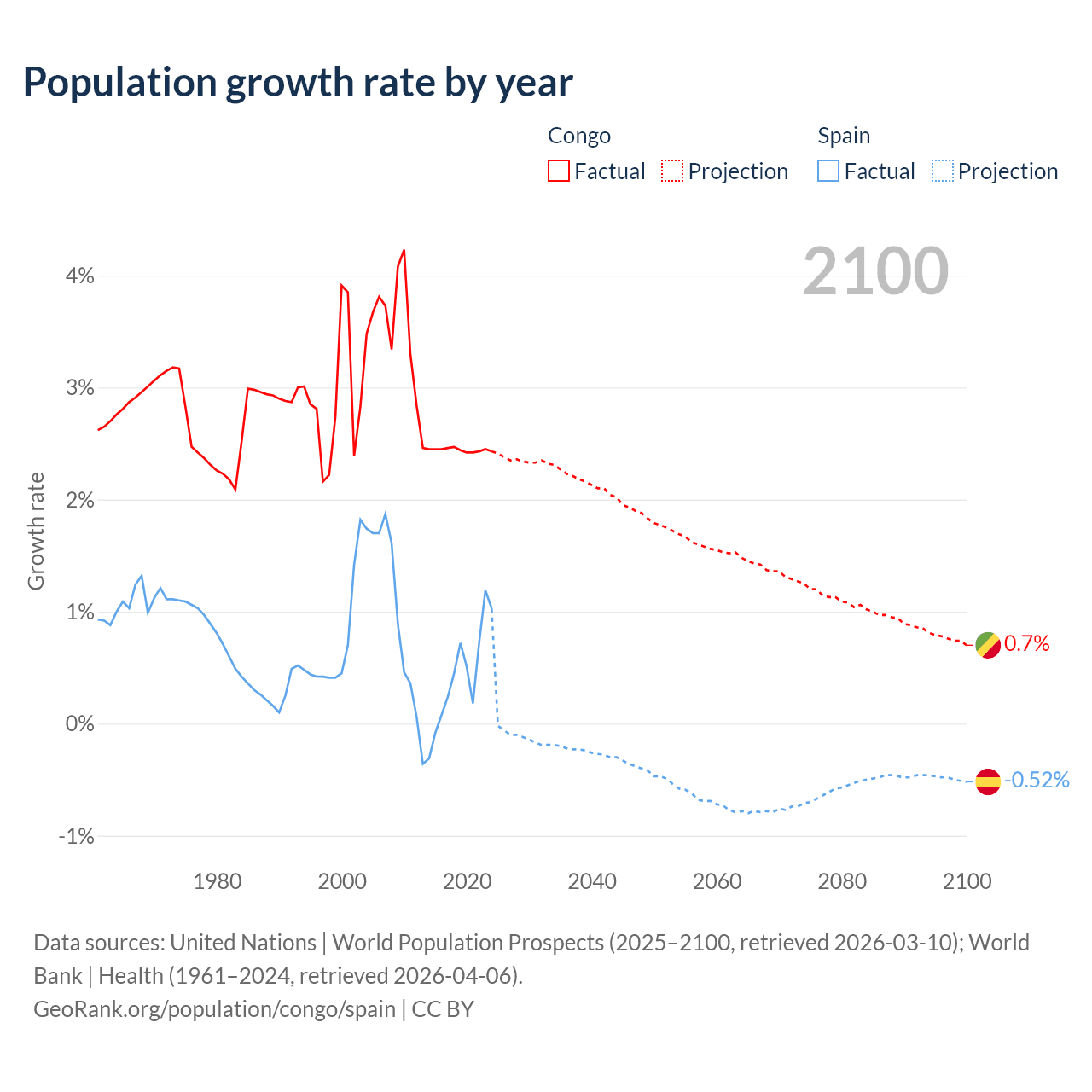 - For the last 10 years, the Congo has had an average growth rate of +2.44% per year vs +0.43% in Spain.
