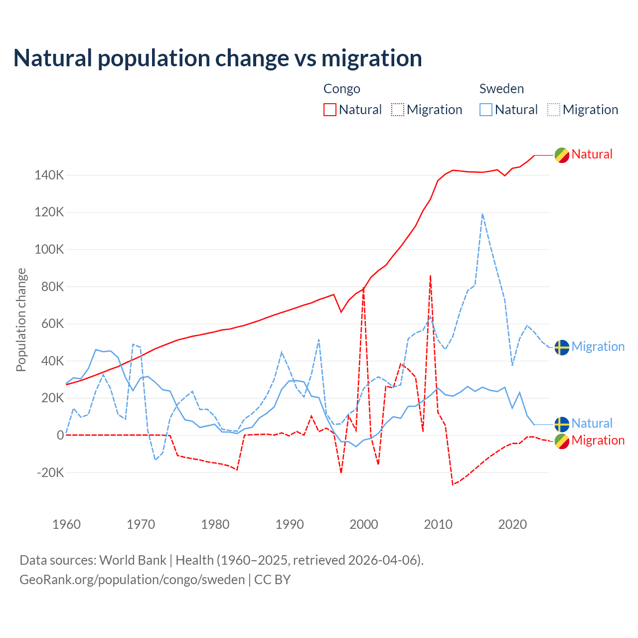 Over the last 10 years, 94% of the population change in the Congo is from natural causes (a gain of 1,434,056 people) and 6.04% is from migration (a loss of 92,251 people). In Sweden 21.4% is from natural causes (a gain of 201,900 people) and 78.6% is from migration (a gain of 743,642 people).