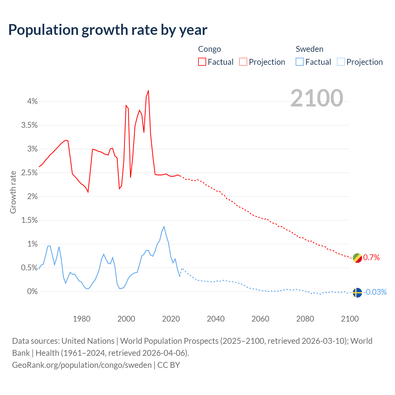 - For the last 10 years, the Congo has had an average growth rate of +2.44% per year vs +0.88% in Sweden.