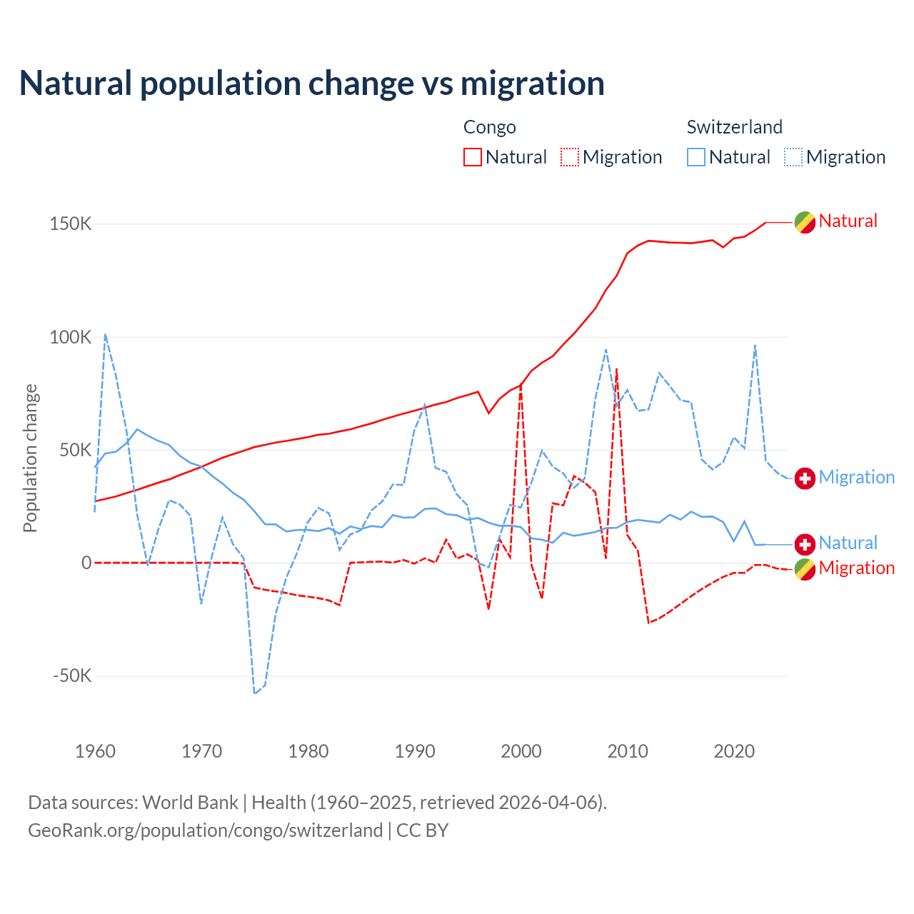 Over the last 10 years, 94% of the population change in the Congo is from natural causes (a gain of 1,434,056 people) and 6.04% is from migration (a loss of 92,251 people). In Switzerland 21.6% is from natural causes (a gain of 165,354 people) and 78.4% is from migration (a gain of 600,145 people).