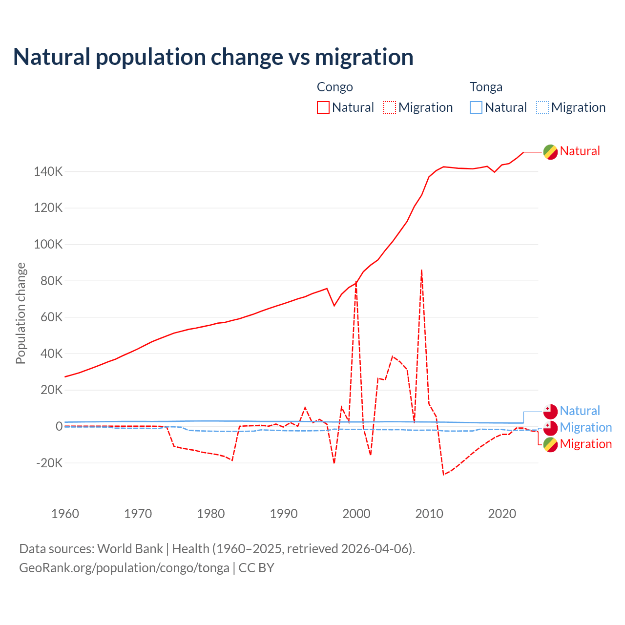 Over the last 10 years, 94% of the population change in the Congo is from natural causes (a gain of 1,434,056 people) and 6.04% is from migration (a loss of 92,251 people). In Tonga 46.9% is from natural causes (a gain of 18,919 people) and 53.1% is from migration (a loss of 21,384 people).
