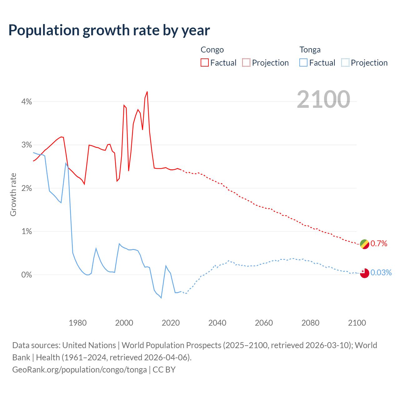 - For the last 10 years, the Congo has had an average growth rate of +2.44% per year vs -0.25% in Tonga.
