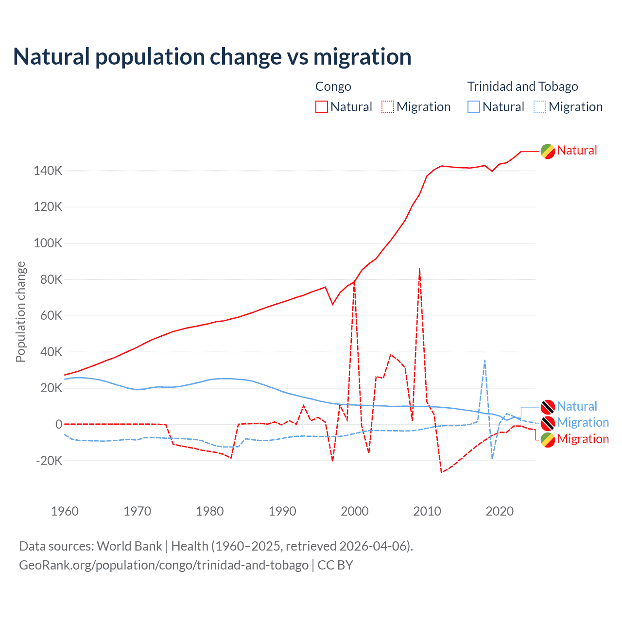 Over the last 10 years, 94% of the population change in the Congo is from natural causes (a gain of 1,434,056 people) and 6.04% is from migration (a loss of 92,251 people). In Trinidad and Tobago 66% is from natural causes (a gain of 55,887 people) and 34% is from migration (a gain of 28,785 people).