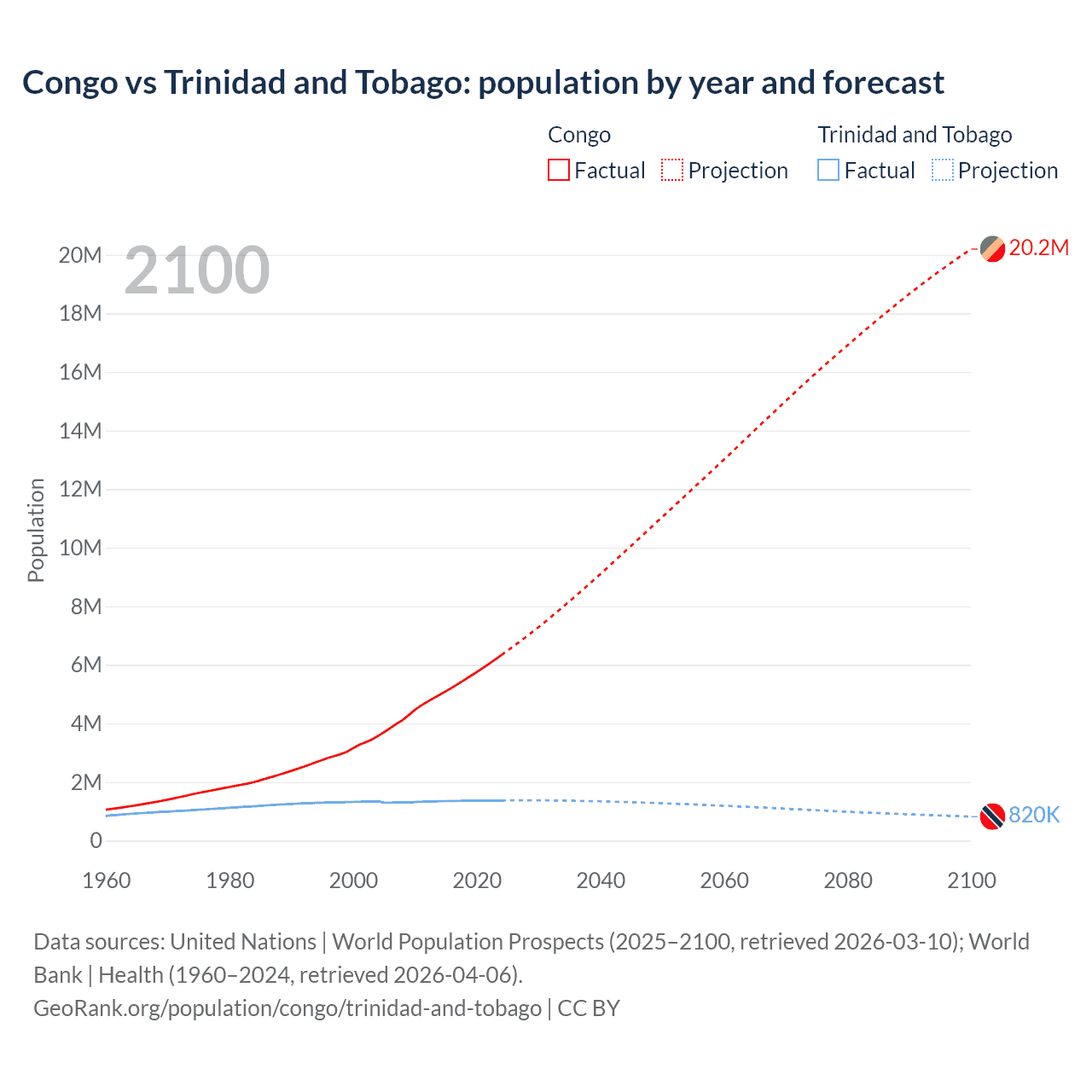 The latest officially reported population of the Congo was 6,332,961 in 2024 vs 1,368,333 people in Trinidad and Tobago in 2024. In 2026, based on the adjusted UN estimation, the current Congo's population is 6,681,829 people compared to 1,374,840 in Trinidad and Tobago.