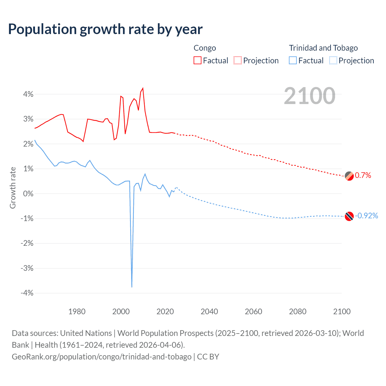 - For the last 10 years, the Congo has had an average growth rate of +2.44% per year vs +0.19% in Trinidad and Tobago.