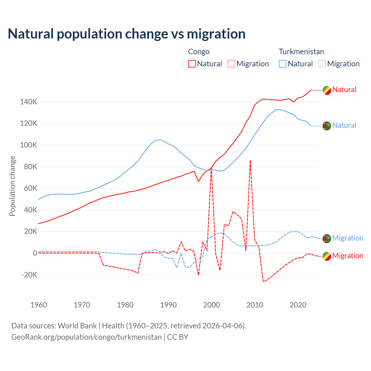 Over the last 10 years, 94% of the population change in the Congo is from natural causes (a gain of 1,434,056 people) and 6.04% is from migration (a loss of 92,251 people). In Turkmenistan 89.2% is from natural causes (a gain of 1,270,228 people) and 10.8% is from migration (a gain of 154,379 people).
