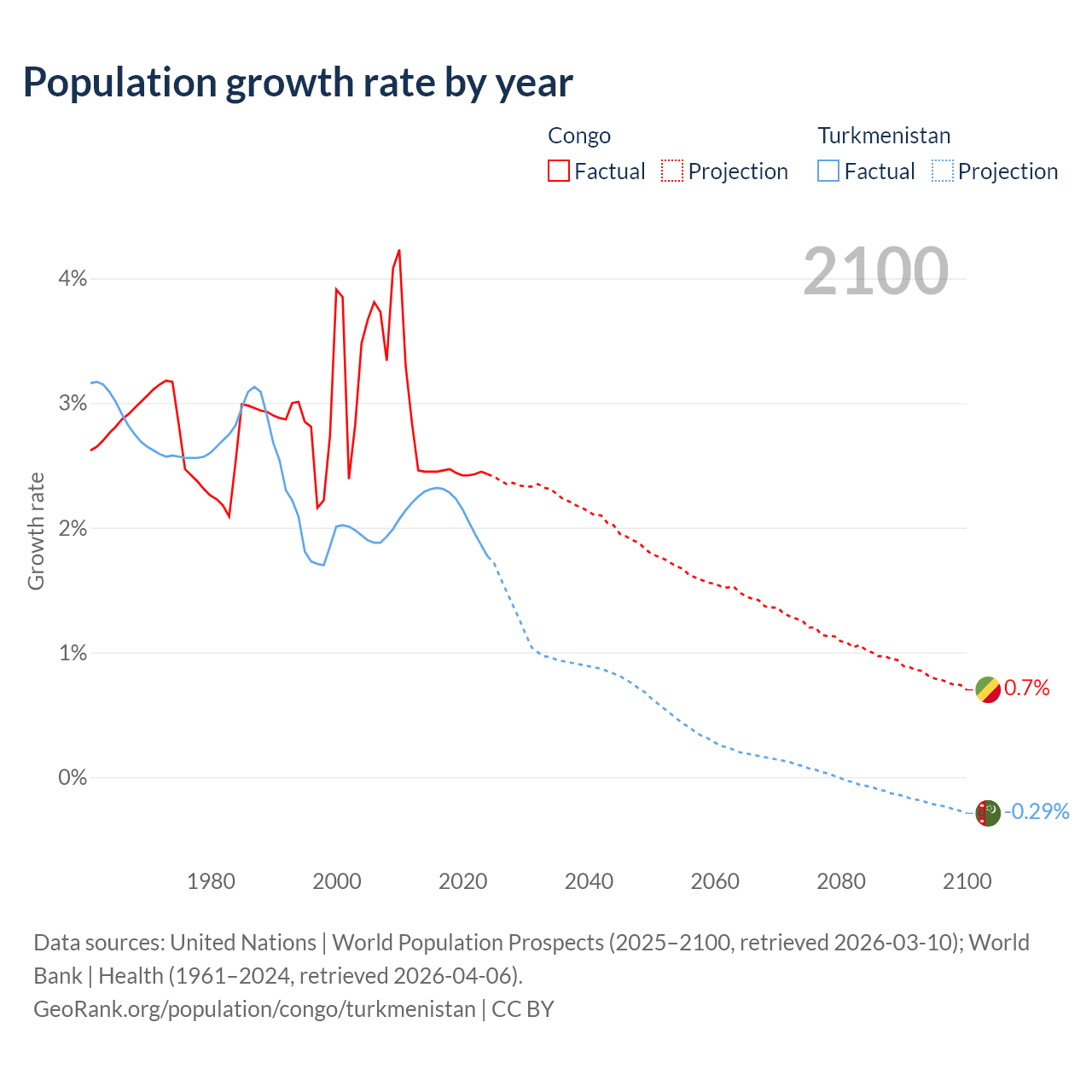 - For the last 10 years, the Congo has had an average growth rate of +2.44% per year vs +2.14% in Turkmenistan.