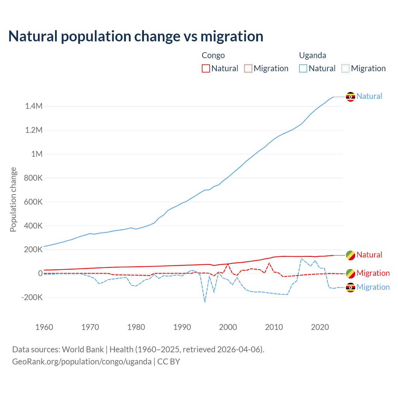Over the last 10 years, 94% of the population change in the Congo is from natural causes (a gain of 1,434,056 people) and 6.04% is from migration (a loss of 92,251 people). In Uganda 99.5% is from natural causes (a gain of 13,419,712 people) and 0.53% is from migration (a gain of 71,457 people).