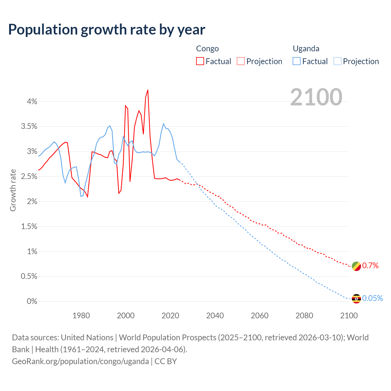 - For the last 10 years, the Congo has had an average growth rate of +2.44% per year vs +3.21% in Uganda.